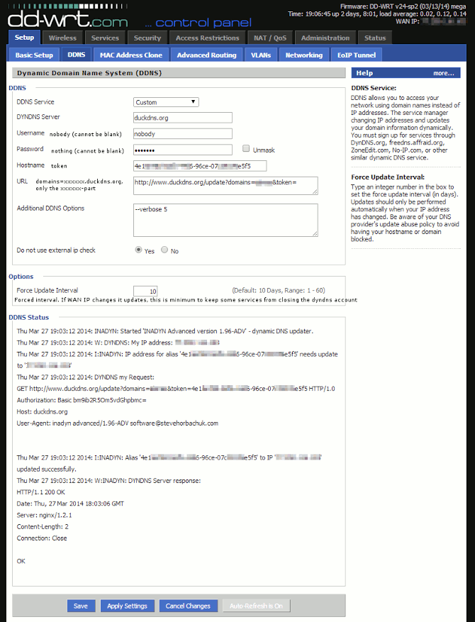 dyndns service modify name = custom [server] = www.duckdns.org [port] = www-http (leave as default) [request] = /update/exampledomain/a7c4d0ad-114e-40ef-ba1d-d217904a50f2 [updateinterval] = 10800 (in seconds - this 3 hours) [retryinterval] = 30 (left as default) [max_retry] = 3 (left as default) saveallnow open the gui interface for the router in your web browser and go to the dyndns settings.