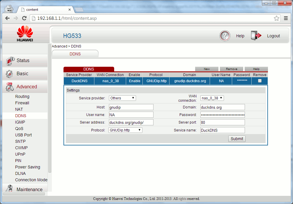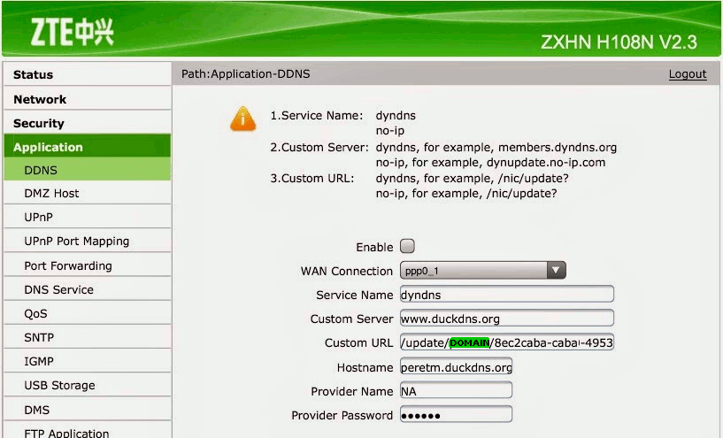 Service provider:Others Host:exampledomain User name:NA Server address:duckdns.org/gnudip/ Protocol:GNUDip.http WAN connection:nas_0_38 Domain:duckdns.org Password:a7c4d0ad-114e-40ef-ba1d-d217904a50f2 Server port:80 Service name:DuckDNSnow check that your IP, has updated in our domains screen.