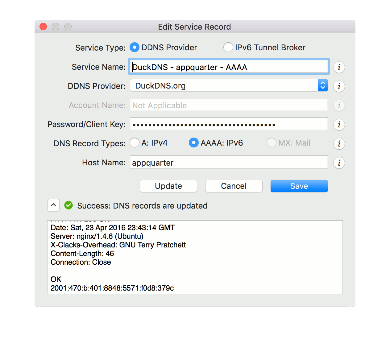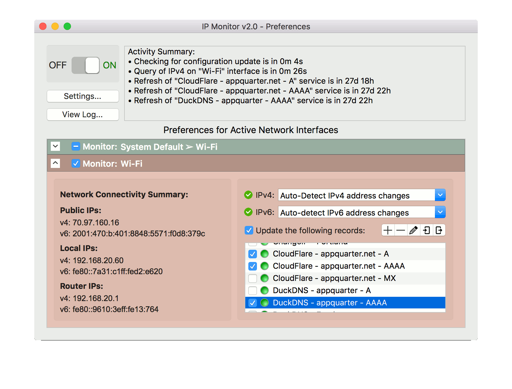IP Monitor is an easy to use dynamic DNS update client for OS X.It supports DuckDNS and other dynamic DNS providers.
