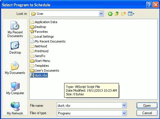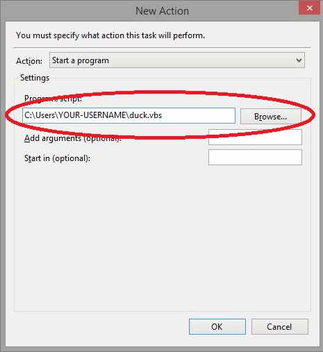 Next go to the Actions tab and select New. In the ']Program/script' field select the Browse button. In the new window that opened, click on âThis PCâ on the left column and then go to C:\Users\YOUR-USERNAME and click once on the script you created before. Click OPEN on the bottom of the window then click OK and OK again on the Create Task window.