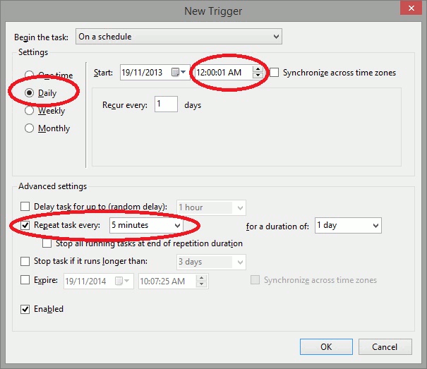 Set the Trigger to be Daily, starting at 12:00:01AM and tick the box to 'Repeat task every:' and set it to 5 minutes. (Refer to image below). Click OK when done.